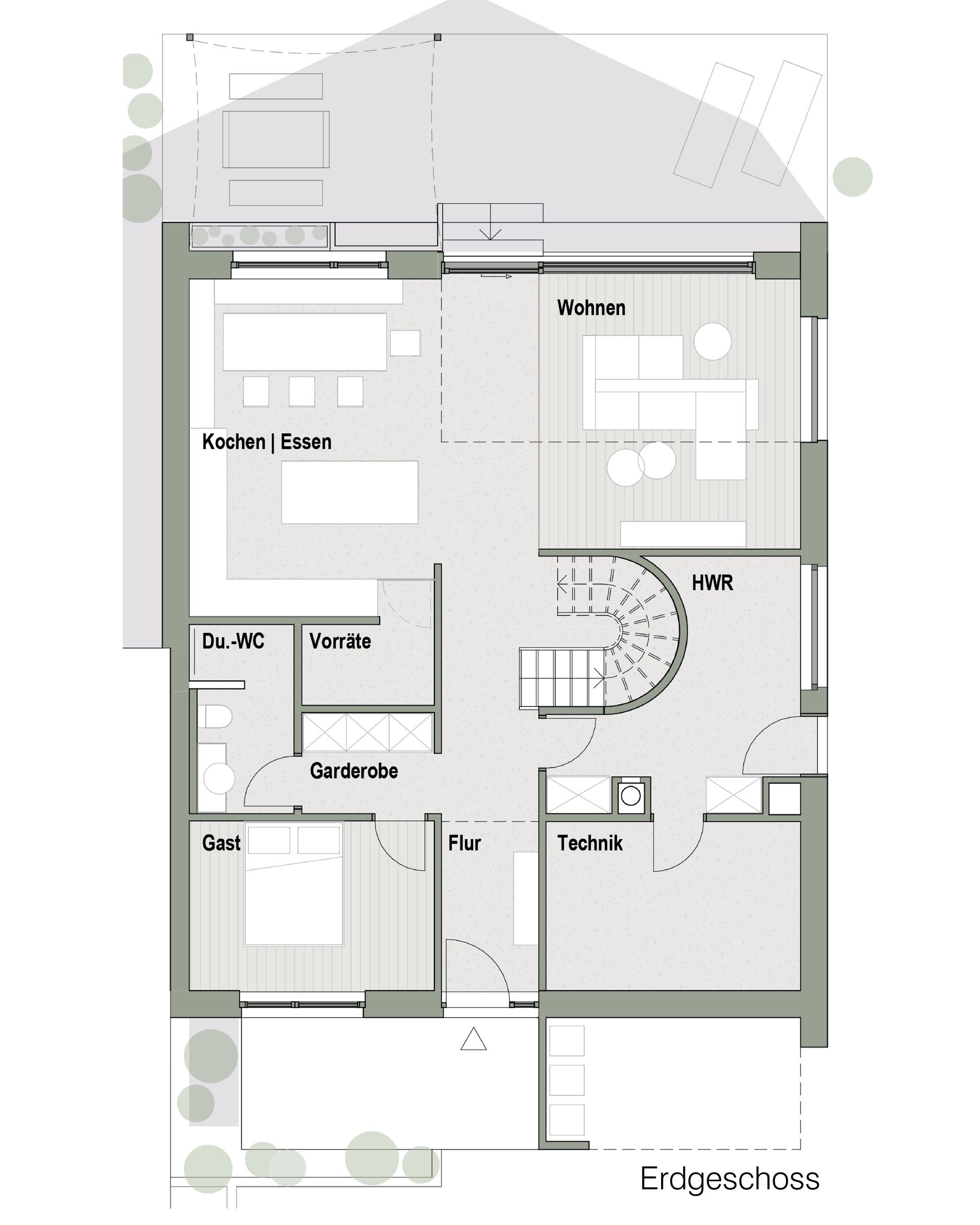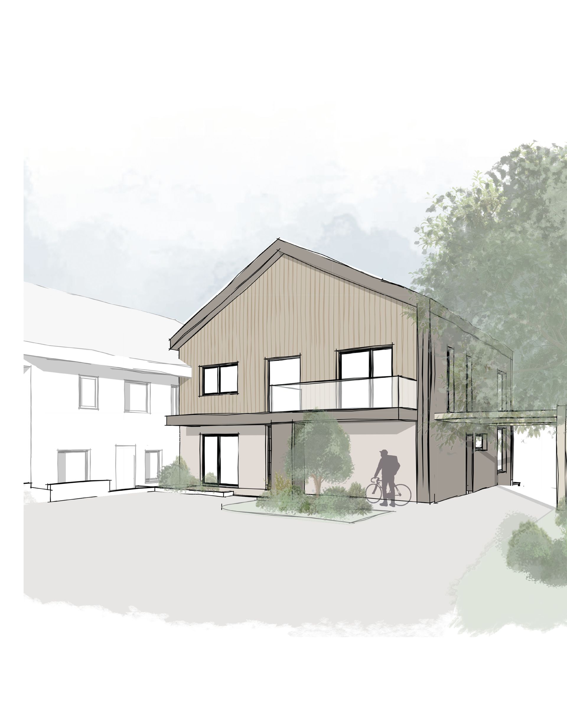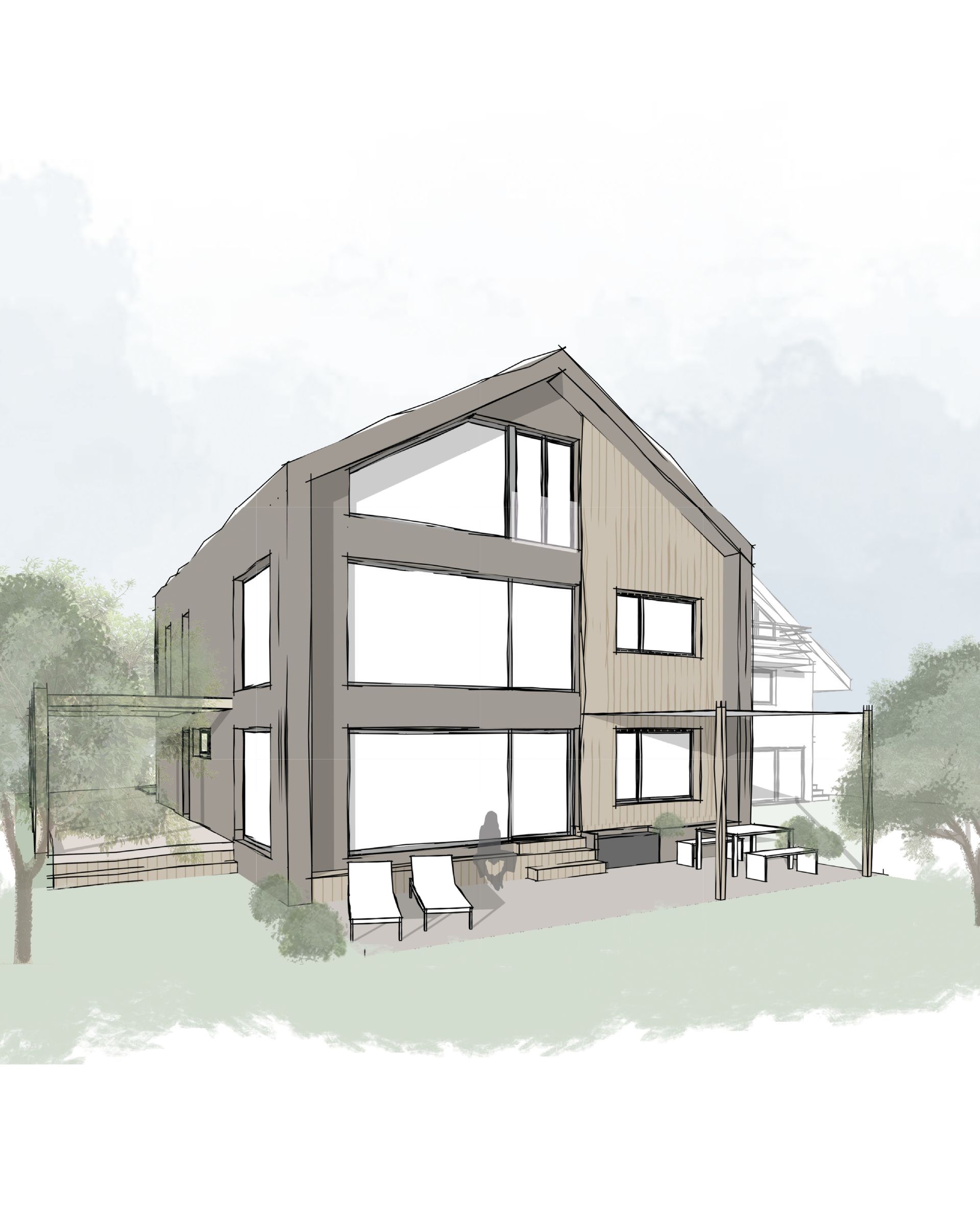 Auf der Bodenplatte einer ehemaligen Werkstatthalle entsteht ein neues Wohnhaus in Holzbauweise. Die großzügig verglaste Nordfassade mit Blick auf Garten und Weinberge, eine runde Teppe, 2 Lufträume mit Galerie und ein großzügiger Elternbereich unter dem Dach sind neben dem Fokus auf nachhaltiges Bauen besondere Merkmale an diesem Projekt.